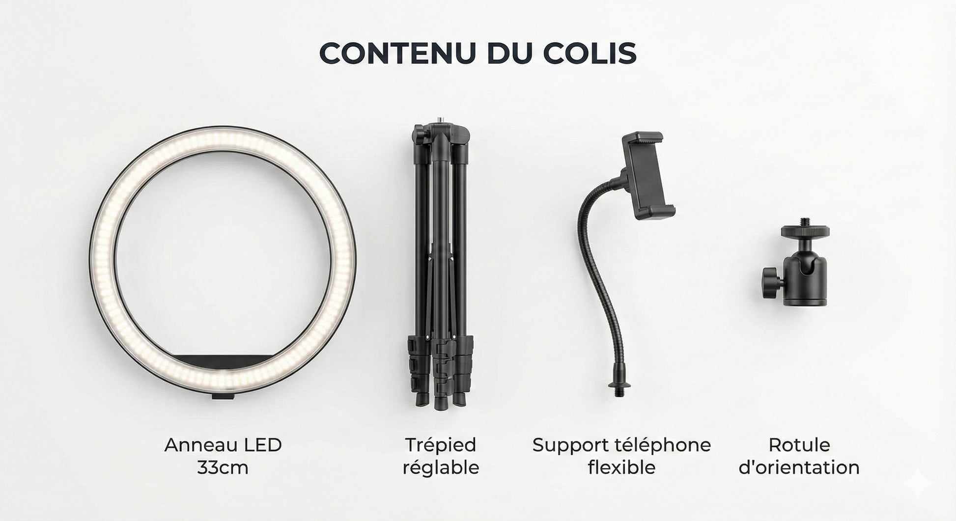 Contenu du colis : Anneau LED 33cm, Trépied réglable, Support téléphone flexible, Rotule d'orientation.